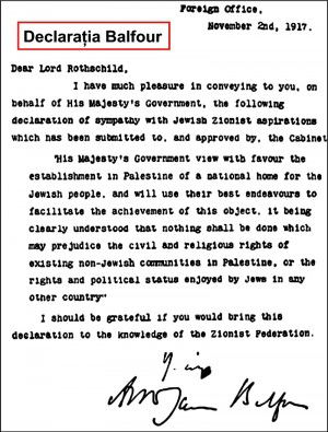 Am deosebita plăcere de a-ți înmâna, în numele Guvernului Majestăţii Sale următoarea declarație de simpatie cu aspirațiile evreilor sioniști, care a fost supusă şi aprobată de Cabinet: „Guvernul Majestăţii Sale privește cu favoare stabilirea în Palestina a unui Cămin național pentru poporul evreu şi-i va folosi bunele oficii pentru a facilita atingerea acestui obiectiv; este de înțeles că nu se va face nimic ce ar putea prejudicia drepturile civile şi religioase ale comunităților non-evreiești existente în Palestina sau drepturile şi status-ul politic obținut de evrei în alte țări." Îți voi fi recunoscător dacă vei aduce această declarație la cunoștință Federației Sioniste.