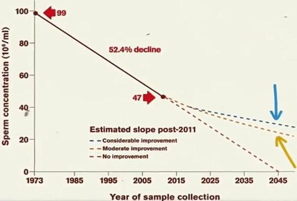 Aceștia au arătat, într-una dintre cele mai riguroase cercetari făcute în acest domeniu până acum, care este evoluția concentrației spermei la societatea umană, în special la populația vestică, din țările așa zis ”dezvoltate”. Mai mult, datele cercetării arată că, dacă se continuă cu acest trend, în 2045 media concentrației de spermă va fi aproape zero: